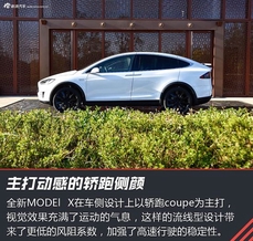 车侧的设计风格是MODEL X的一大亮点,它COUPE轿跑般的身姿看上去更加灵动顺滑,这当然为它带来了更低的风阻系统——Cd 0.24,其优点在于稳定的高速驾驶感受,低油耗的享受以及加速感的提升。